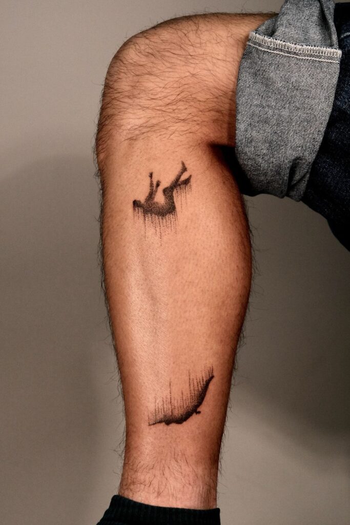 This artistic piece shows a shadowy figure falling in two stages, creating a surreal illusion of descent or emotional transformation.
