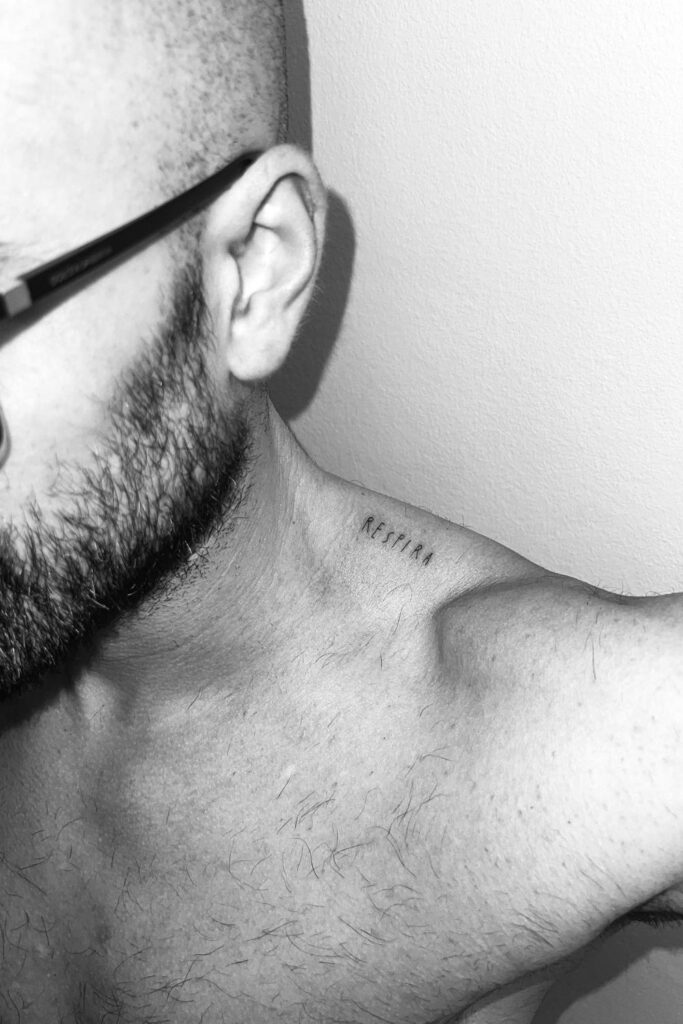The word Respira (Spanish for “breathe”) etched just above the collarbone is a timeless mantra for calm in chaos.