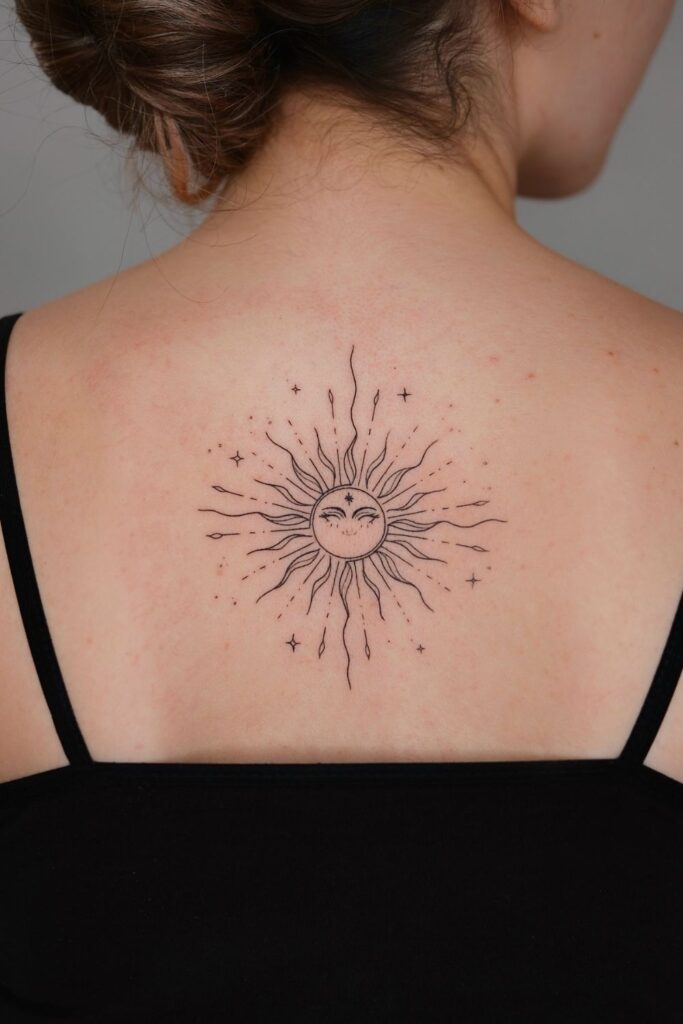 This beautifully centered back tattoo by berkayerkul features a peaceful sun with closed eyes, radiating soft rays and surrounded by tiny stars.
