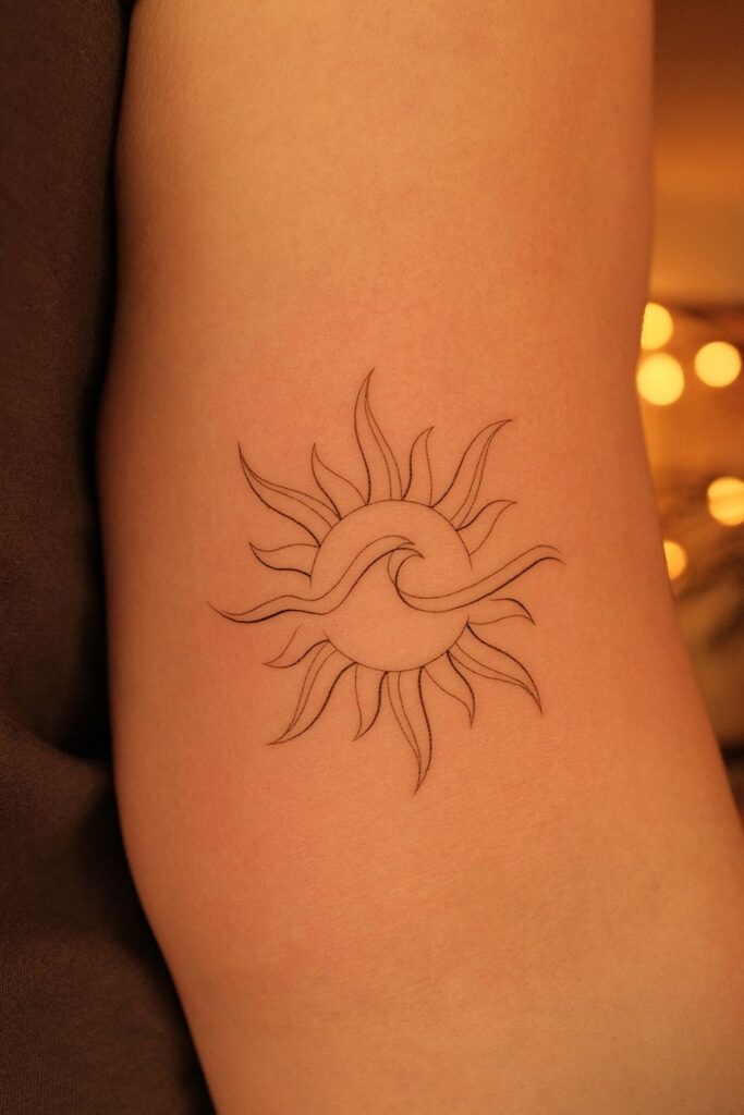 In this sleek linework tattoo by dardani.tattoo, the sun’s rays blend seamlessly into ocean waves, creating a graceful fusion of fire and water.