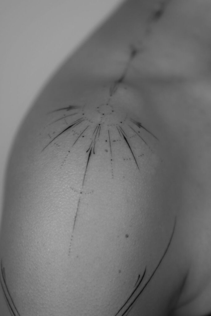 This fine line tattoo by ninapost.ink gives the illusion of a celestial burst, like a starlight explosion across the skin.