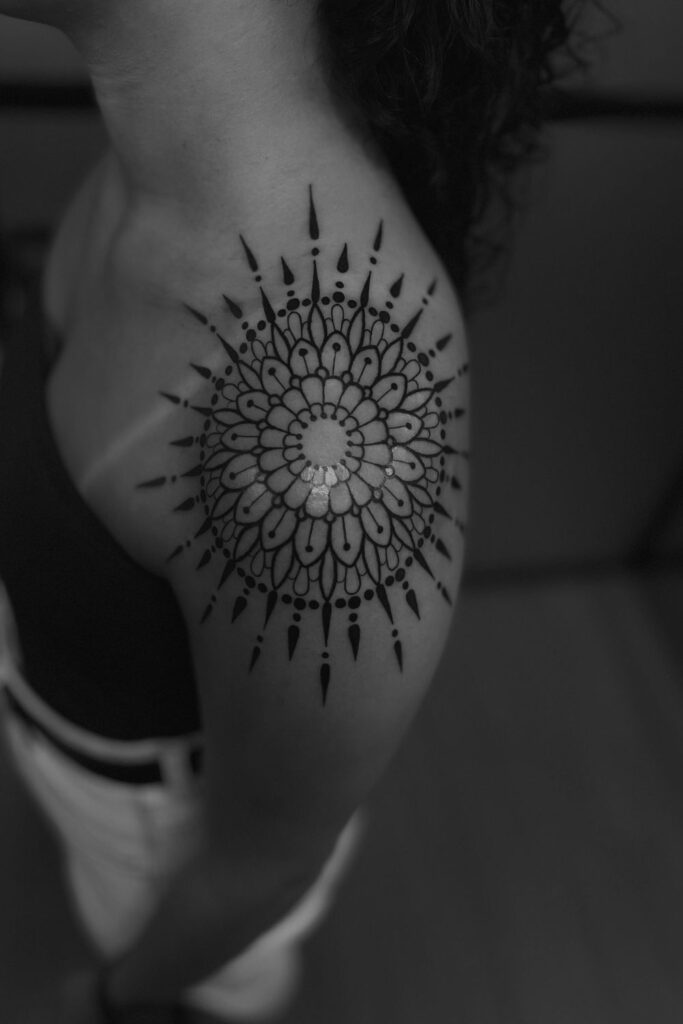 This striking black ink mandala spreads like a radiant shield across the shoulder, symbolizing balance, spiritual protection, and power within stillness.