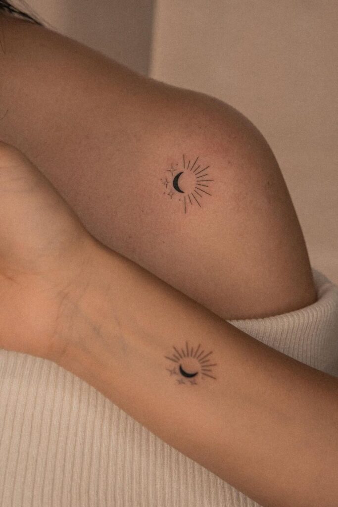 Simple yet meaningful, these twin tattoos feature a crescent moon surrounded by stars and rays, symbolizing intuition, change, and connection.