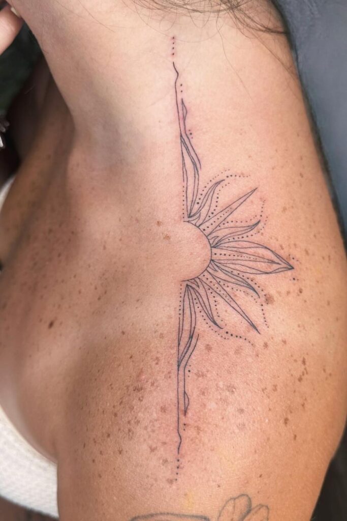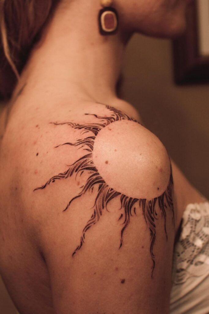 This radiant tattoo features a stylized sunburst wrapping gracefully around the shoulder, symbolizing light, vitality, and the power of renewal.