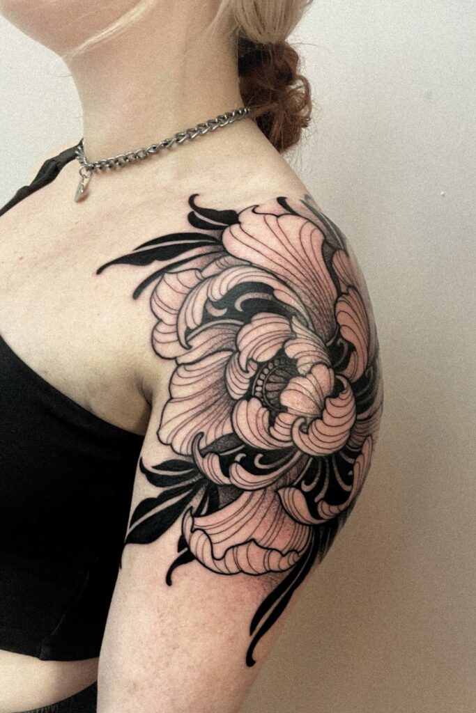 Bold Peony Shoulder Cap Tattoo