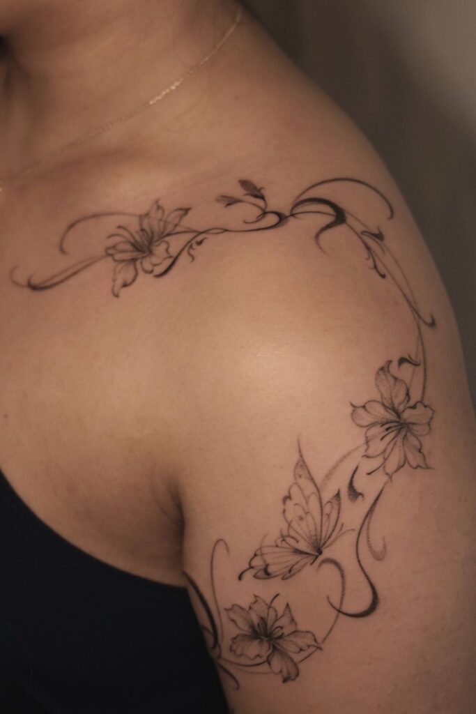 Elegant and dreamy, this tattoo wraps across the shoulder in a vine-like movement with flowers and butterflies, symbolizing transformation, femininity, and the journey of the soul.