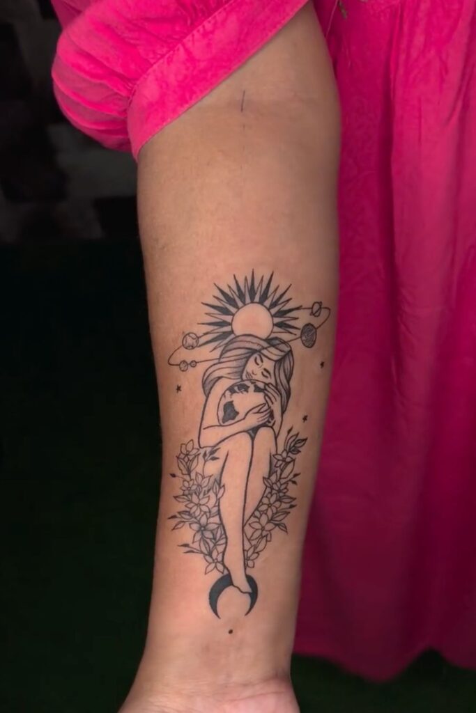 This empowering virgo inspired tattoo shows a goddess figure holding the Earth, surrounded by stars, plants, and planetary orbits.