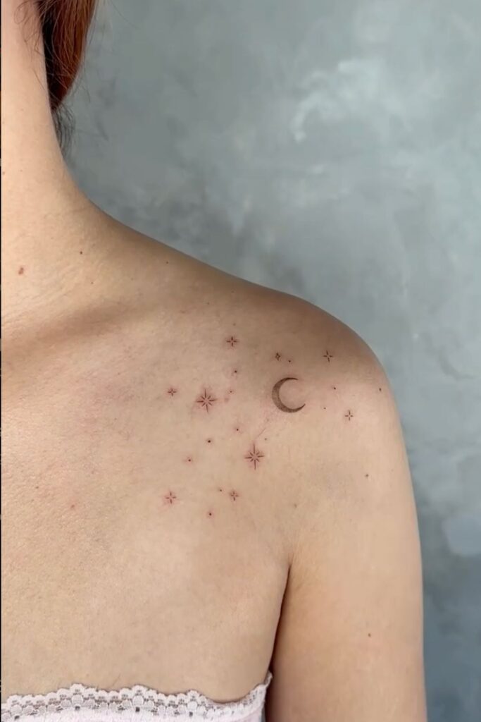 Gracefully scattered across the shoulder, this minimalist virgo aesthetic tattoo uses stars and a crescent moon to hint at celestial beauty.