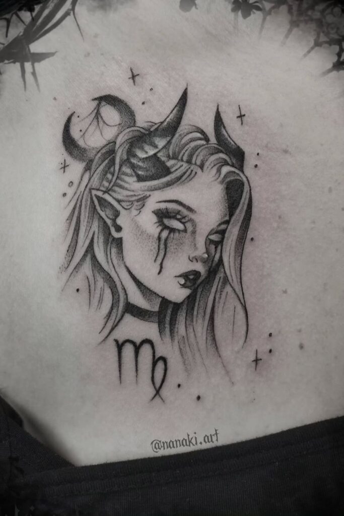 Bold and enchanting, this gothic-inspired virgo sign tattoo reimagines the Virgo archetype with a mysterious edge.