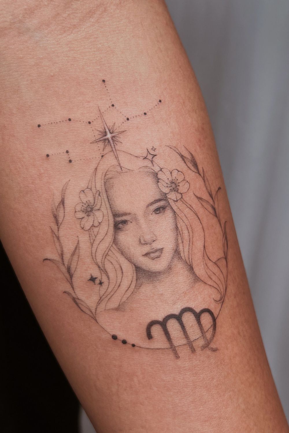 This design is great for dreamers, stargazers, and introverts who want their virgo tattoo to be a poetic expression of their soul.