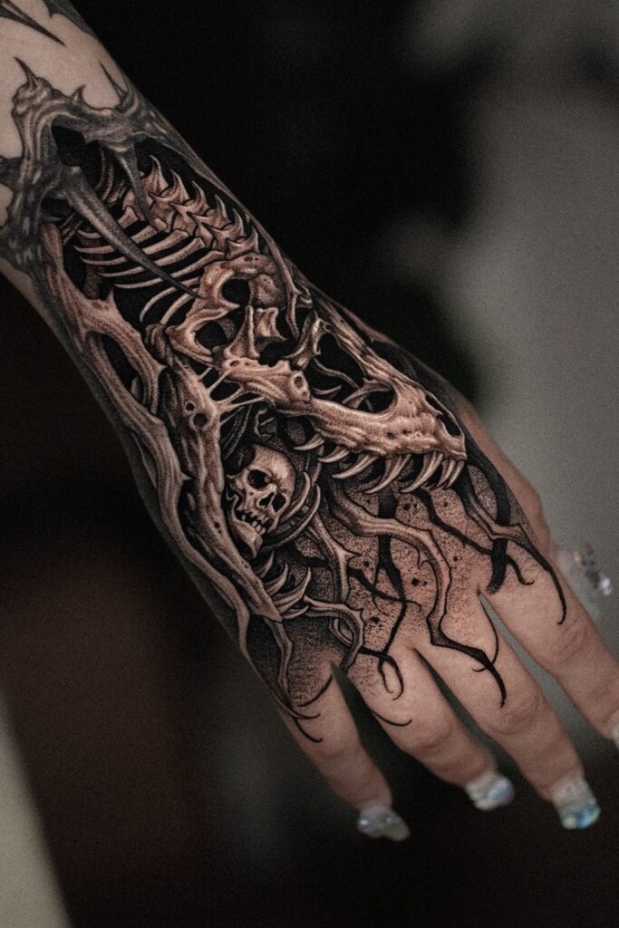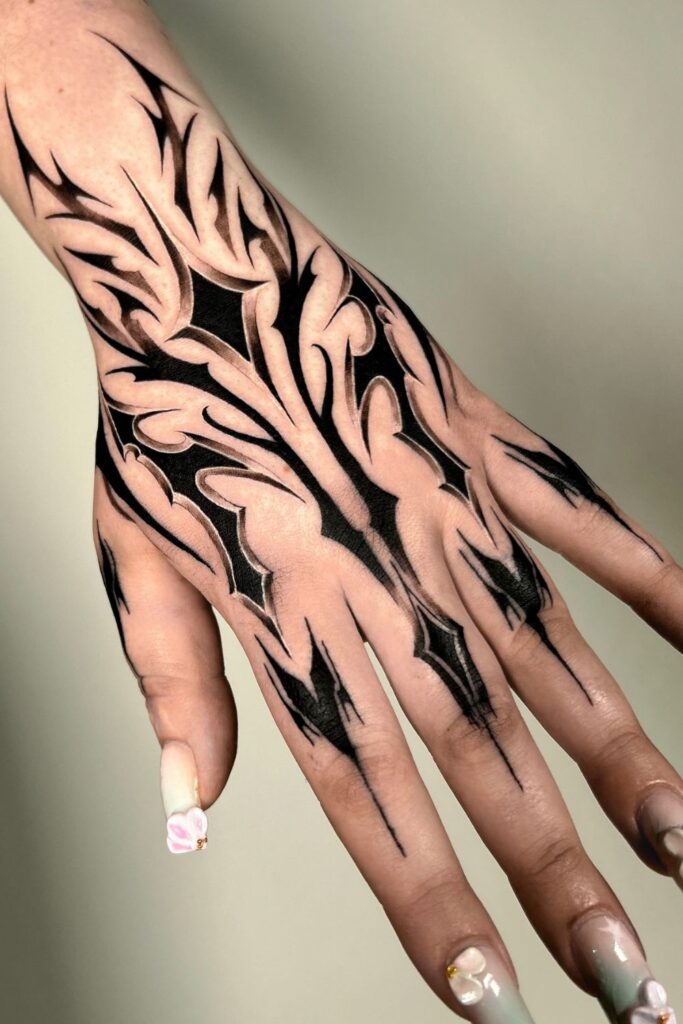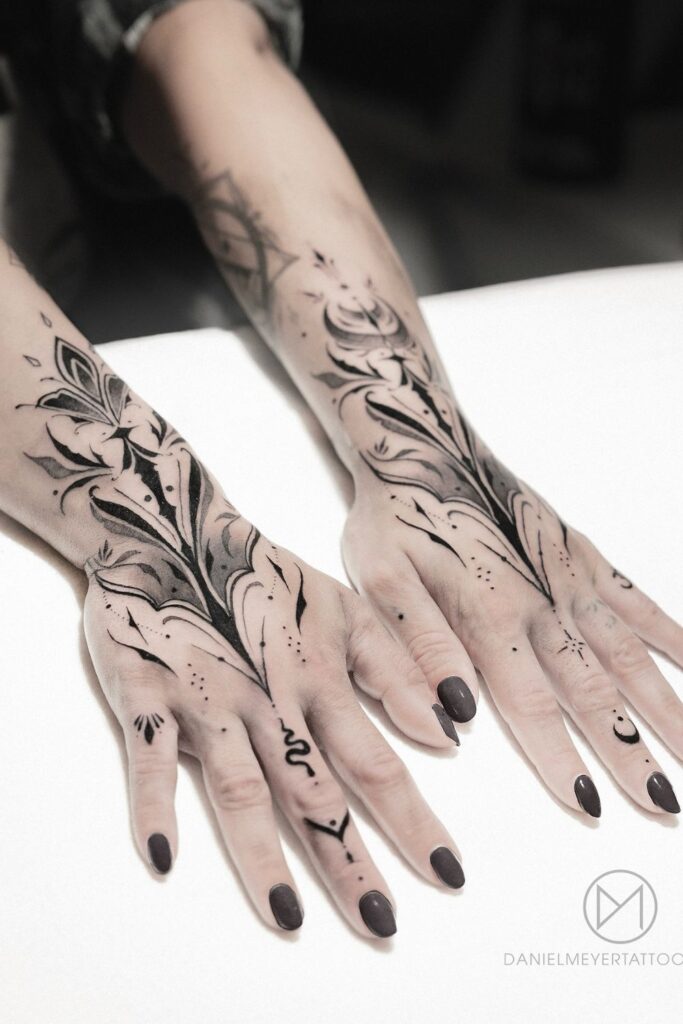 A stunning option among dark hand tattoos women love for its texture and mystery.