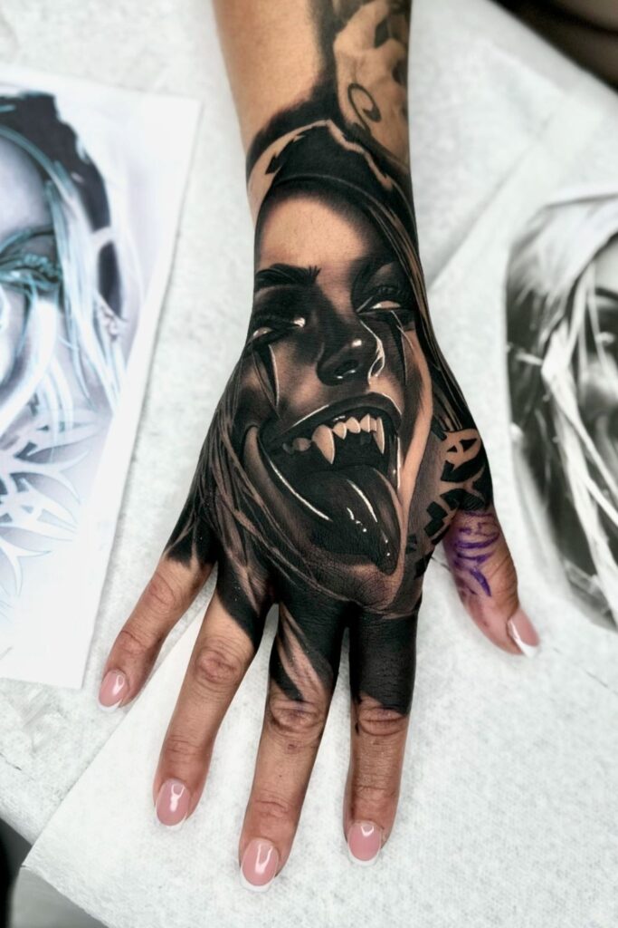 This hyper-realistic face with vampire fangs brings dark hand tattoos women to another level.