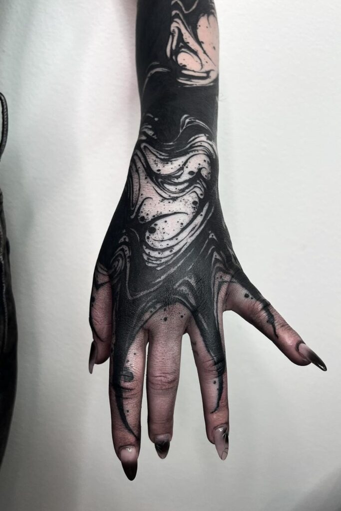 This blackwork marble effect feels like swirling potions or cosmic storms.