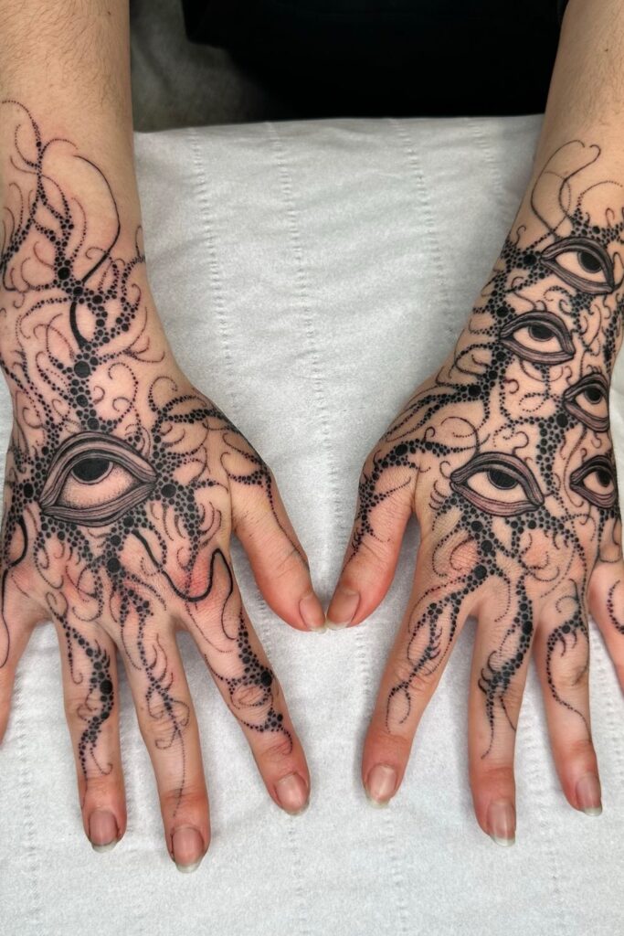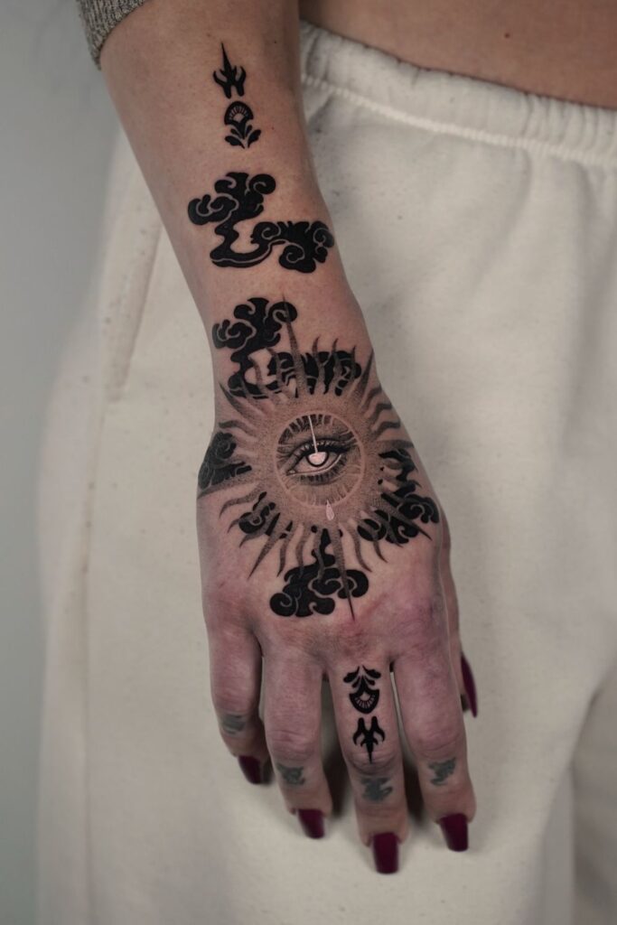 A striking witchy hand tattoosymbolizing intuition, connection, and hidden strength.
