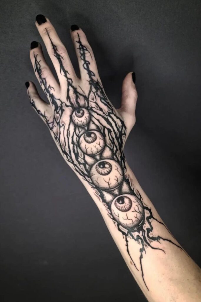 With eerie, veiny eyes running down the hand, this surreal design represents constant awareness and a deeper connection to hidden realms.