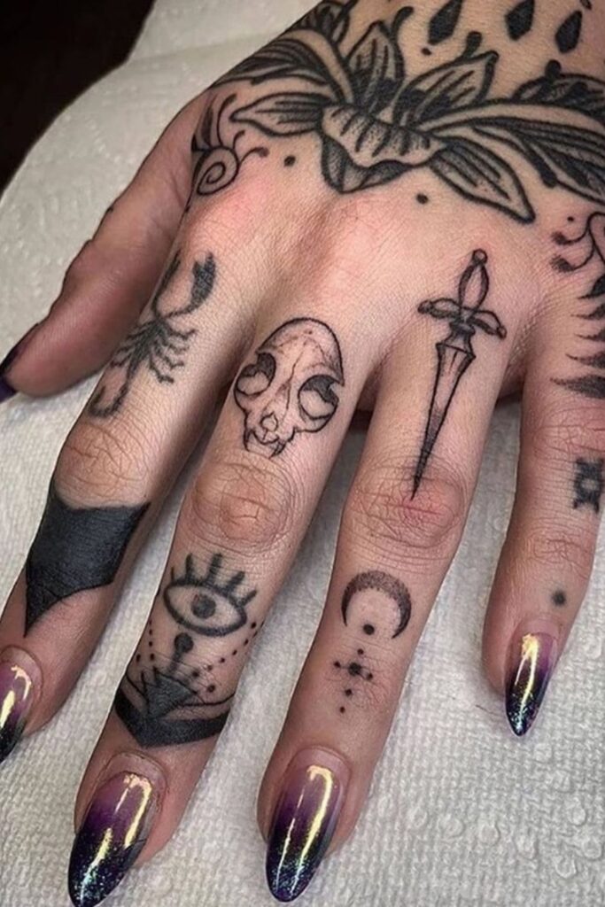 From bats hand tattoo designs to celestial fingers or mystical black cats, there’s a universe of inspiration waiting for you.