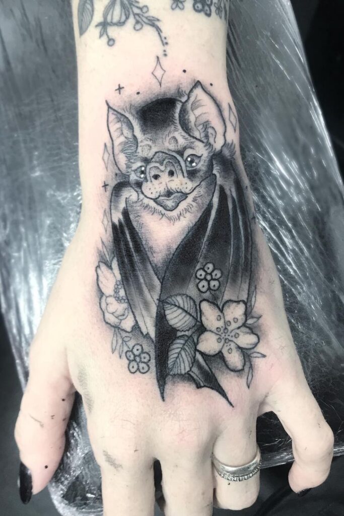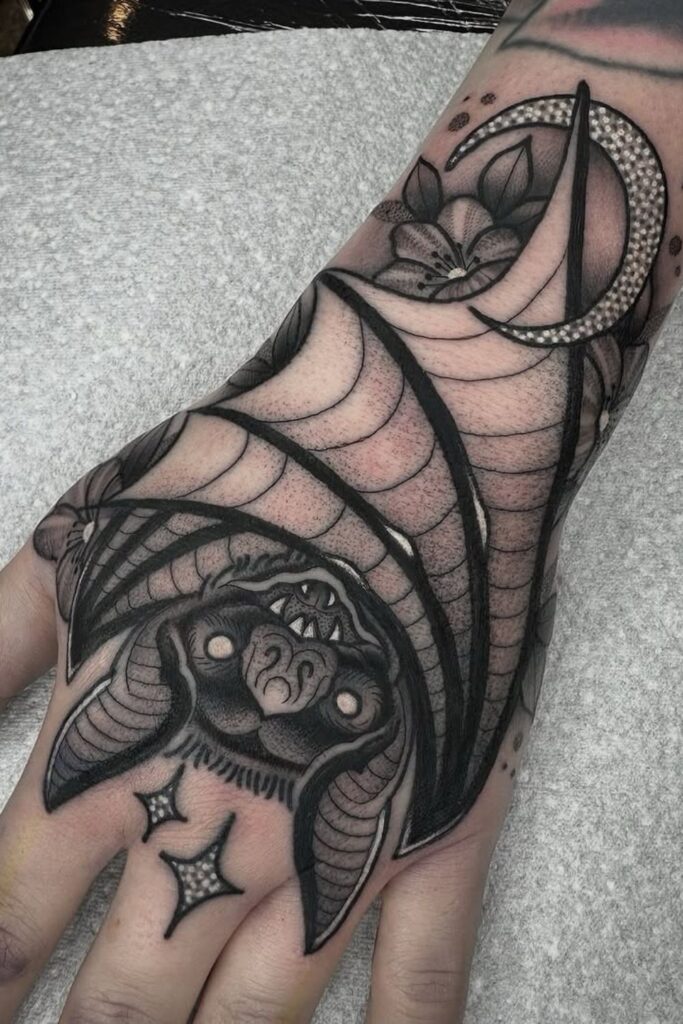 Bats symbolize intuition and rebirth, making them perfect for witchy hand tattoos.