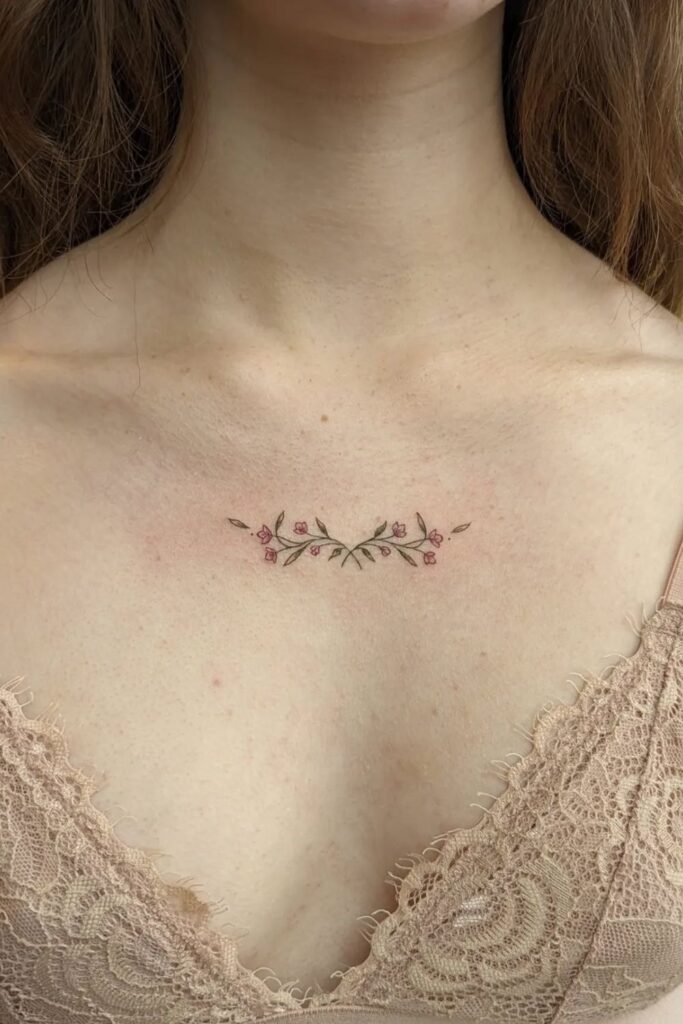 This dainty chest tattoo female features a fine-line floral wreath, adding a soft and feminine touch to the chest area.