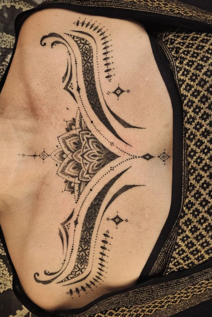 The symmetrical design flows beautifully across the chest, making it ideal for those looking for dot chest tattoo female styles that blend precision with artistic depth.