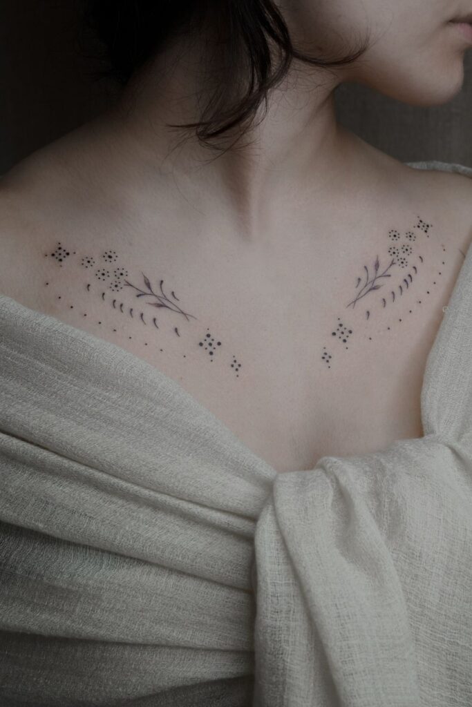 This delicate and minimalist chest tattoo is a perfect blend of elegance and symmetry.