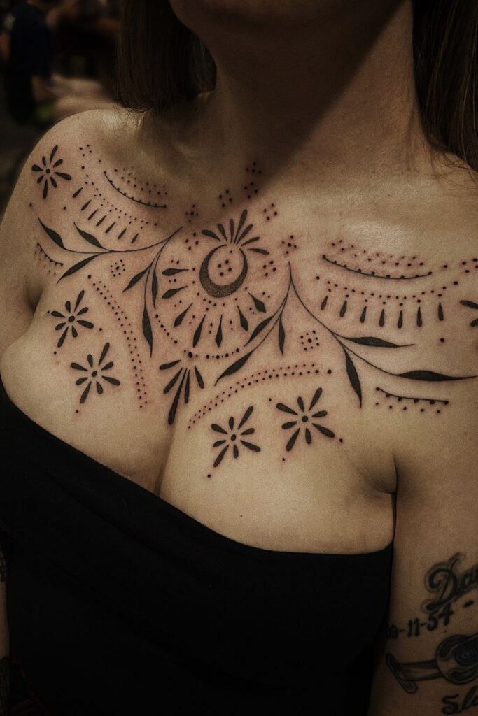 A stunning boho chest tattoo, this dot chest tattoo female combines celestial elements with floral details for a magical, enchanting effect.