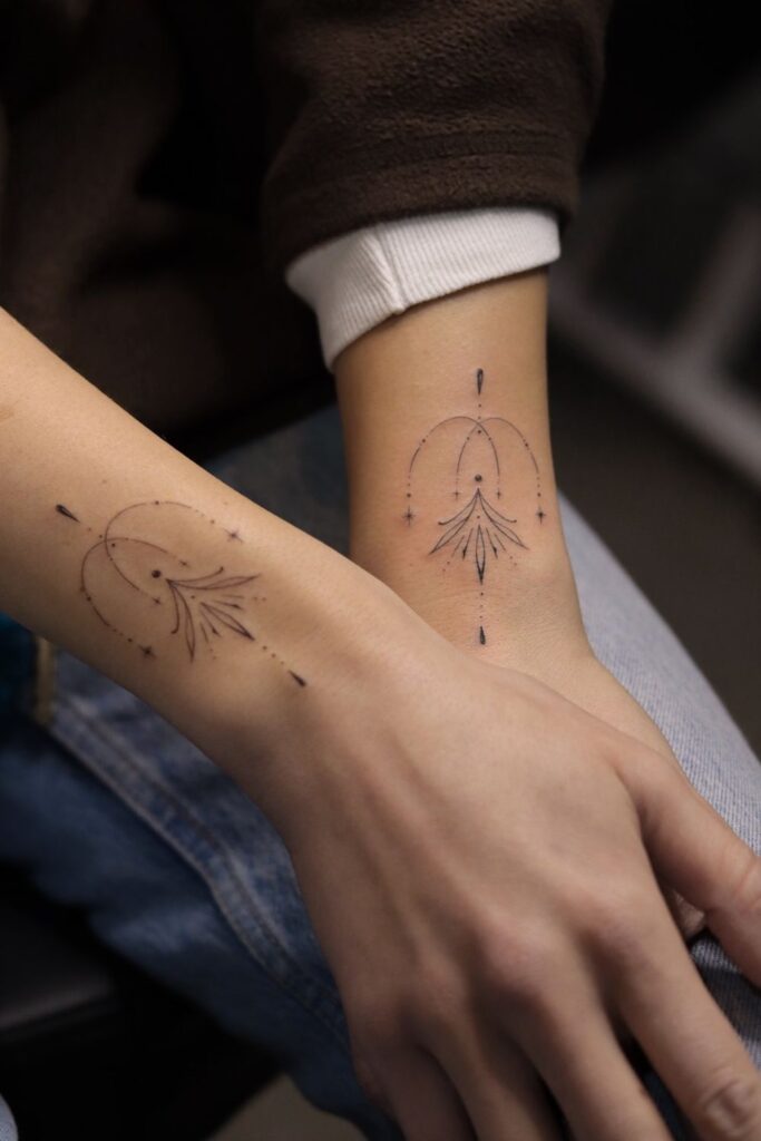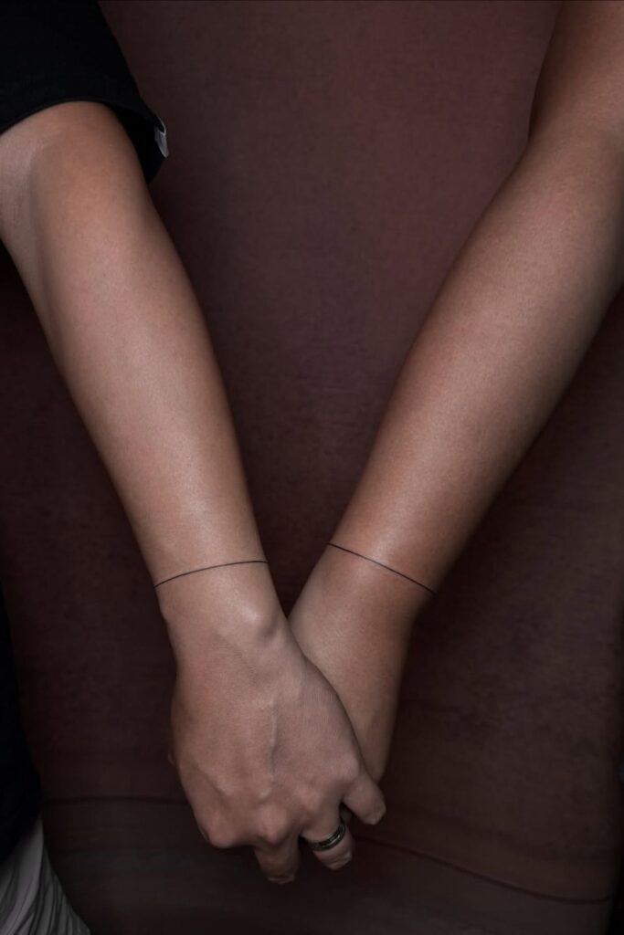 These ultra-fine, minimalist matching line tattoos wrap gently around the wrist like a silent vow, symbolizing connection, balance, and unity.