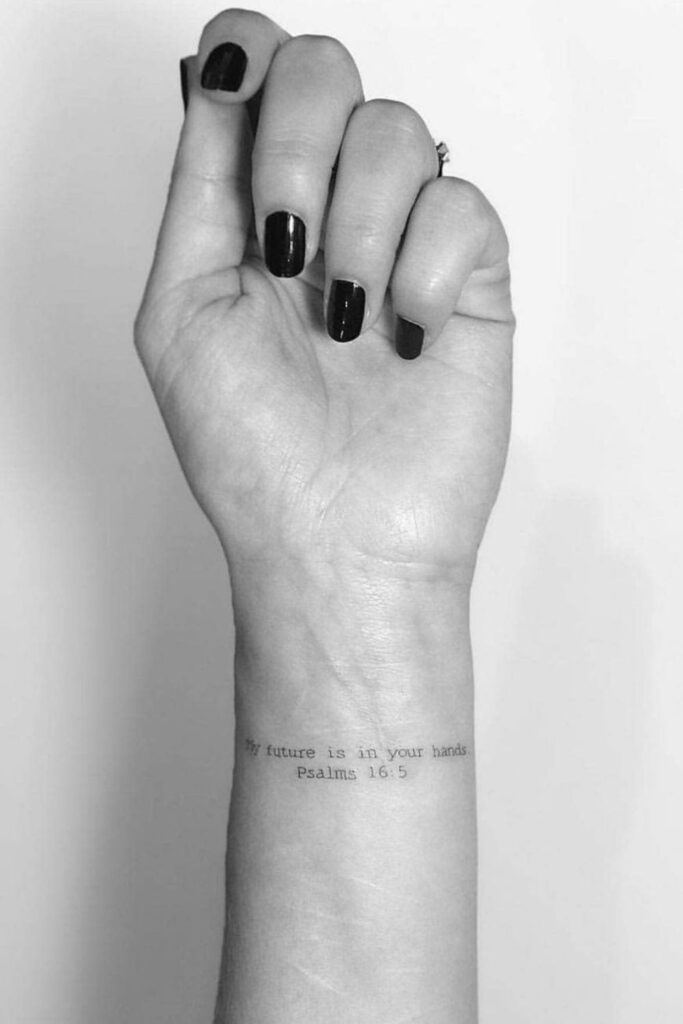 This subtle typewriter-style tattoo featuring “My future is in your hands – Psalms 16:5” offers a powerful message of faith and surrender.