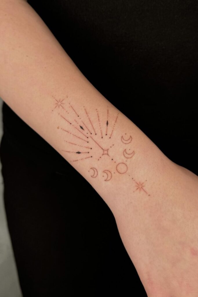 This celestial wrist tattoo captures the phases of the moon surrounded by radiant starbursts and cosmic rays.