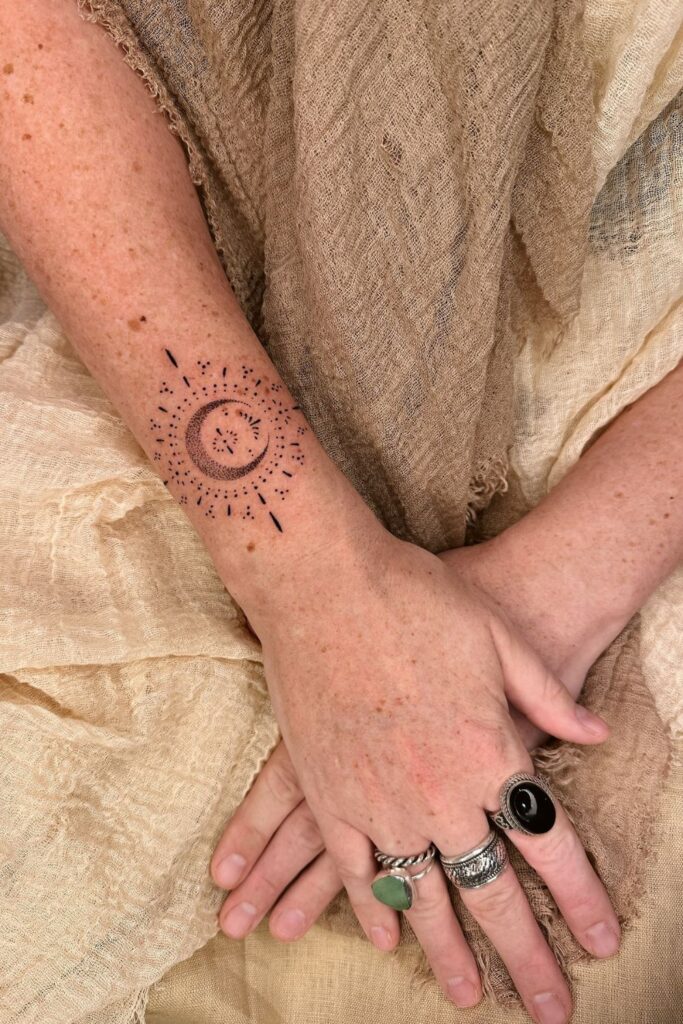 This design is especially lovely for spiritual souls or stargazers who want a small wrist tattoo that’s full of meaning.