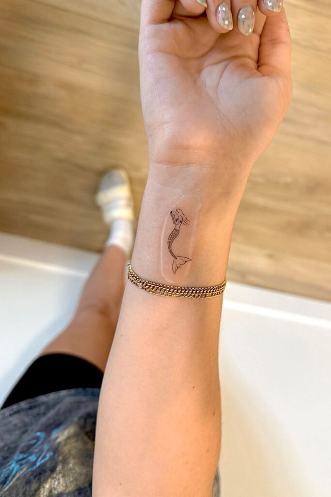 This dainty mermaid swimming upward on the inner wrist channels freedom, femininity, and the mystery of the sea.