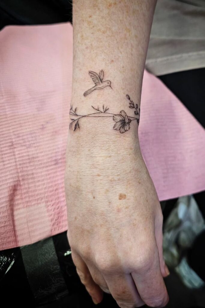 This gorgeous wrap around wrist tattoo for women features a hummingbird in motion, sipping from delicate blooms that circle the wrist like a bracelet.